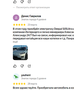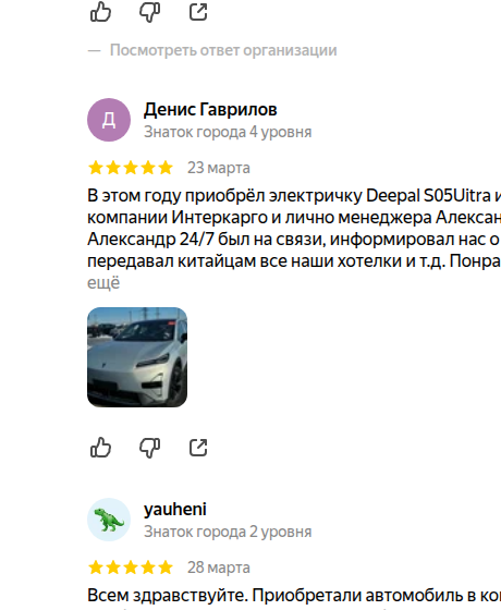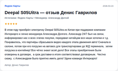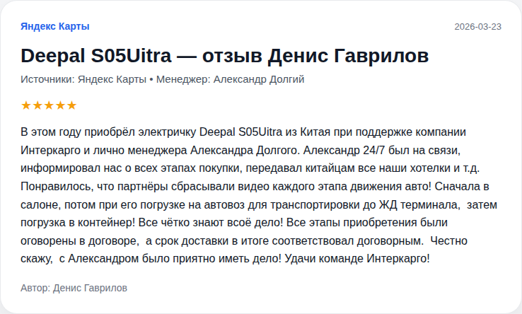 В этом году приобрёл электричку Deepal S05Uitra из Китая при поддержке компании Интеркарго и лично менеджера Александра Долгого. Александр 24/7 был на связи, информировал нас о всех этапах покупки, передавал китайцам все наши хотелки и т.д. Понравилось, что партнёры сбрасывали видео каждого этапа движения авто! Сначала в салоне, потом при его погрузке на автовоз для транспортировки до ЖД терминала, затем погрузка в контейнер! Все чётко знают всоё дело! Все этапы приобретения были оговорены...