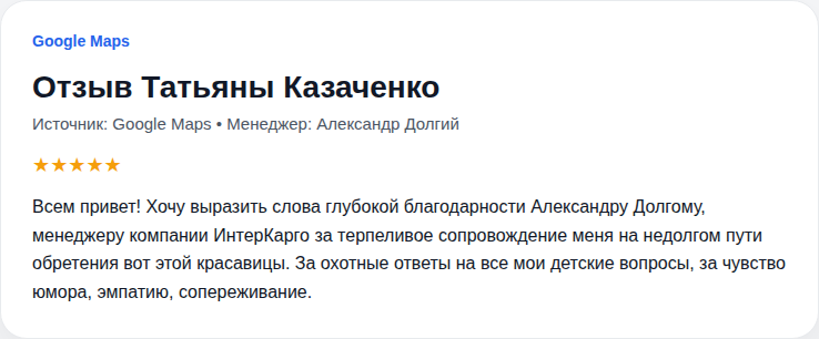 Всем привет! Хочу выразить слова глубокой благодарности Александру Долгому, менеджеру компании ИнтерКарго за терпеливое сопровождение меня на недолгом пути обретения вот этой красавицы. За охотные ответы на все мои детские вопросы, за чувство юмора, эмпатию, сопереживание. С Александром этот путь был настолько гармоничным, что я готова пройти его ещё не раз.