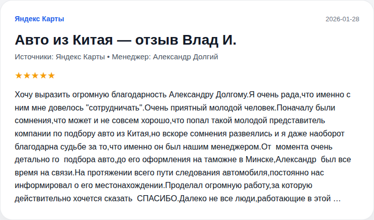 Хочу выразить огромную благодарность Александру Долгому.Я очень рада,что именно с ним мне довелось "сотрудничать".Очень приятный молодой человек.Поначалу были сомнения,что может и не совсем хорошо,что попал такой молодой представитель компании по подбору авто из Китая,но вскоре сомнения развеялись и я даже наоборот благодарна судьбе за то,что именно он был нашим менеджером.От момента очень деталь