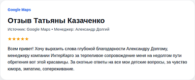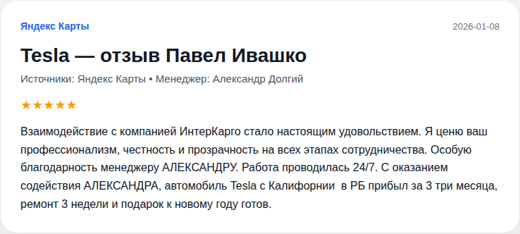 Взаимодействие с компанией ИнтерКарго стало настоящим удовольствием. Я ценю ваш профессионализм, честность и прозрачность на всех этапах сотрудничества. Особую благодарность менеджеру АЛЕКСАНДРУ. Работа проводилась 24/7. С оказанием содействия АЛЕКСАНДРА, автомобиль Tesla с Калифорнии в РБ прибыл за 3 три месяца, ремонт 3 недели и подарок к новому году готов.