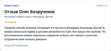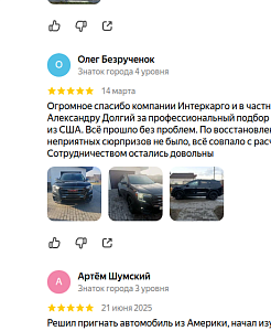 Огромное спасибо компании Интеркарго и в частности менеджеру Александру Долгий за профессиональный подбор и доставкв автомобиля из США. Всё прошло без проблем. По восстановлению никаких неприятных сюрпризов не было, всё совпало с расчётом. Сотрудничеством остались довольны
