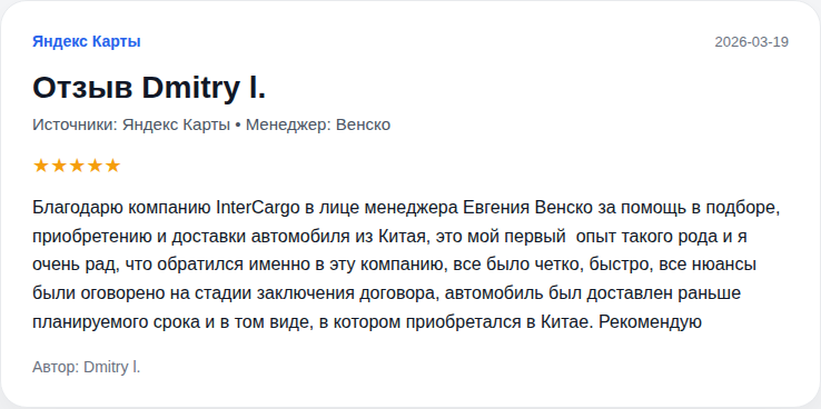 Евгений поделился своим опытом работы с нашей компанией по доставке автомобиля из Китая. Клиент отмечает бесценную помощь менеджера при оформлении договора, который был сопровождён на высшем уровне. Автомобиль был доставлен в кратчайшие сроки. Евгений особо подчёркивает профессионализм команды InterCargo и благодарит за отличную работу.
