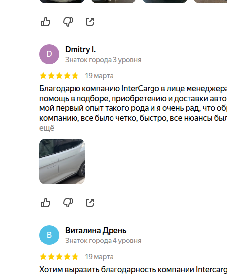 Благодарю компанию InterCargo в лице менеджера Евгения Венско за помощь в подборе, приобретению и доставки автомобиля из Китая, это мой первый опыт такого рода и я очень рад, что обратился именно в эту компанию, все было четко, быстро, все нюансы были оговорено на стадии заключения договора, автомобиль был доставлен раньше планируемого срока и в том виде, в котором приобретался в Китае. Рекомендую