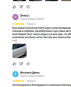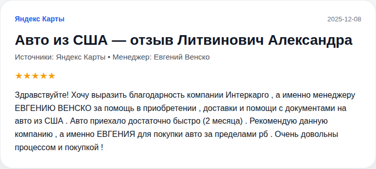 Благодарю компанию «ИнтерКарго» и менеджера данной фирмы Венско Евгения за подбор авто и полную информативность сделки. Связь 24/7, тактичный , внимательный и вежливый персонал. Ожидание заняло на месяц дольше оговоренных сроках, так как авто был с дальнего штата и…