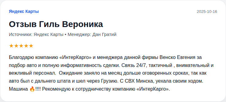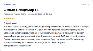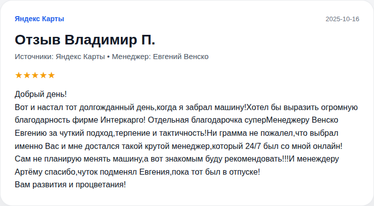 Вот и настал тот долгожданный день,когда я забрал машину!Хотел бы выразить огромную благодарность фирме Интеркарго! Отдельная благодарочка суперМенеджеру Венско Евгению за чуткий подход,терпение и тактичность!Ни грамма не пожалел,что выбрал именно Вас и мне достался такой крутой менеджер,который 24/7 был со мной онлайн!