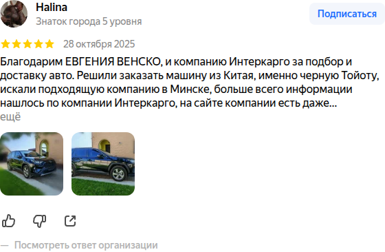 Благодарим ЕВГЕНИЯ ВЕНСКО, и компанию Интеркарго за подбор и доставку авто. Решили заказать машину из Китая, именно черную Тойоту, искали подходящую компанию в Минске, больше всего информации нашлось по компании Интеркарго, на сайте компании есть даже…
