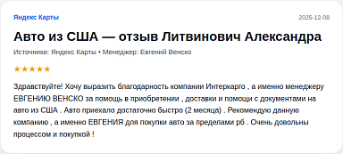 Здравствуйте! Хочу выразить благодарность компании Интеркарго , а именно менеджеру ЕВГЕНИЮ ВЕНСКО за помощь в приобретении , доставки и помощи с документами на авто из США . Авто приехало достаточно быстро (2 месяца) . Рекомендую данную компанию , а…