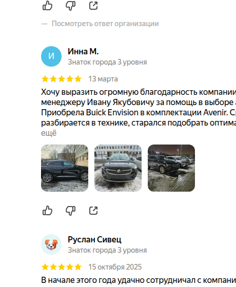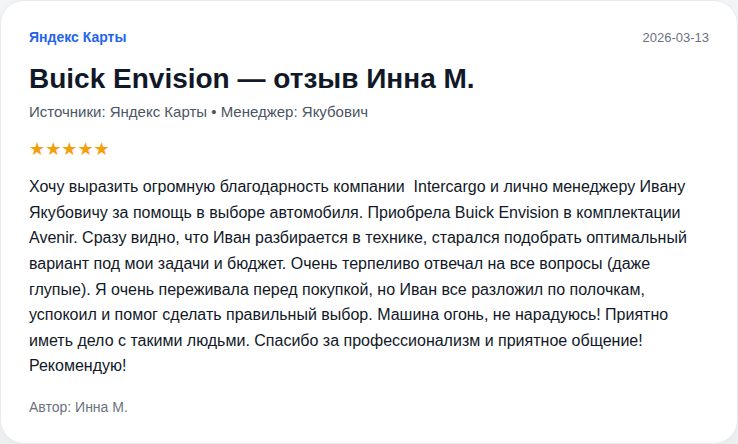 Хочу выразить огромную благодарность компании  Intercargo и лично менеджеру Ивану Якубовичу за помощь в выборе автомобиля. Приобрела Buick Envision в комплектации Avenir. Сразу видно, что Иван разбирается в технике, старался подобрать оптимальный вариант под мои задачи и бюджет. Очень терпеливо отвечал на все вопросы (даже глупые). Я очень переживала перед покупкой, но Иван все разложил по полочкам, успокоил и помог сделать правильный выбор. Машина огонь, не нарадуюсь! Приятно иметь дело...
