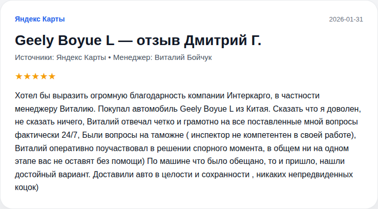 Хотел бы выразить огромную благодарность компании Интеркарго, в частности менеджеру Виталию. Покупал автомобиль Geely Boyue L из Китая. Сказать что я доволен, не сказать ничего, Виталий отвечал четко и грамотно на все поставленные мной вопросы фактически 24/7, Были вопросы на таможне ( инспектор не компетентен в своей работе), Виталий оперативно поучаствовал в решении спорного момента, в общем ни