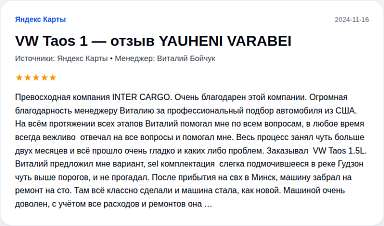 Превосходная компания INTER CARGO. Очень благодарен этой компании. Огромная благодарность менеджеру Виталию за профессиональный подбор автомобиля из США. На всём протяжении всех этапов Виталий помогал мне по всем вопросам, в любое время всегда вежливо  отвечал на все вопросы и помогал мне. Весь процесс занял чуть больше двух месяцев и всё прошло очень гладко и каких либо проблем. Заказывал  VW Tao