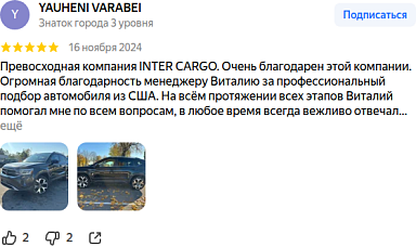 Превосходная компания INTER CARGO. Очень благодарен этой компании. Огромная благодарность менеджеру Виталию за профессиональный подбор автомобиля из США. На всём протяжении всех этапов Виталий помогал мне по всем вопросам, в любое время всегда вежливо отвечал…