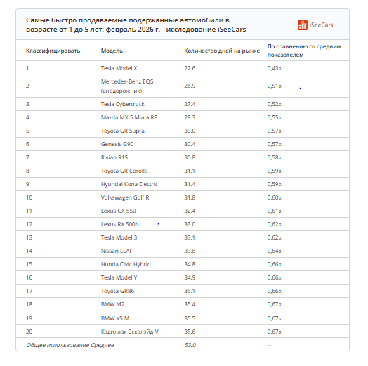 Самыми быстропродаваемыми подержанными автомобилями сегодня являются электромобили, гибриды и традиционные модели, включая четыре Tesla и множество высокопроизводительных или спортивных автомобилей, таких как BMW M2, Mazda Miata, Toyota Supra и Volkswagen Golf R. Все эти машины продавались значительно быстрее среднего времени реализации подержанных авто с пробегом 1–5 лет, которое в феврале 2026 года составляло 53 дня.