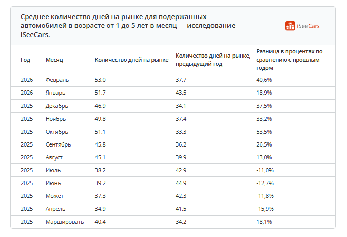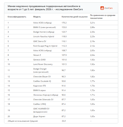 С августа 2025 года среднее время продажи подержанных машин стабильно увеличивалось: с 45 дней в августе до 53 дней в феврале 2026. Практически все марки теперь уходят медленнее: Volvo XC60 гибрид — 170 дней, BMW i5 — 153 дня, Dodge Hornet — 123 дня. Эти машины месяцами стоят у дилеров, потому что спрос низкий, а цены остаются высокими.